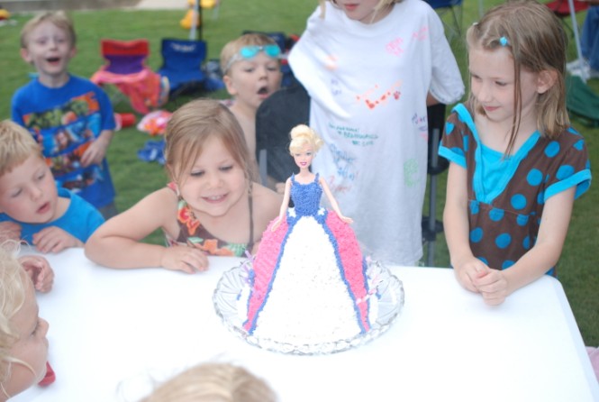 The cake, yet another Barbie princess one. Elizabeth has really gotten into Barbies this year, and Lydia has been interested in them for some time. Both like princesses, so it seemed like a reasonable cake idea. I knew I could do one of those, since this was my fourth or fifth one.