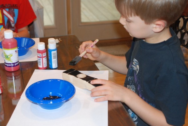 This was our first year participating in AWANA at church, and one of the things they do every year is the AWANA Grand Prix, a pinewood derby race. The kids came up with their ideas and James had Curtis help him cut them out a few days before. The entire thing was kind of short notice date-wise, so we didn't have a lot of time to get them painted. We crammed in painting the day before the race.